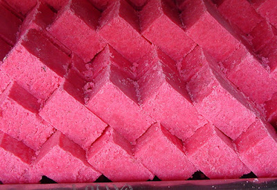 This is coconut candy, all pretty in pink. These candies are usually made from evaporated milk, condensed milk and freshly grated coconut. You can add different colourings and flavourings when making your own at home. Usually they make pink, green, plain vanilla or chocolate ones.